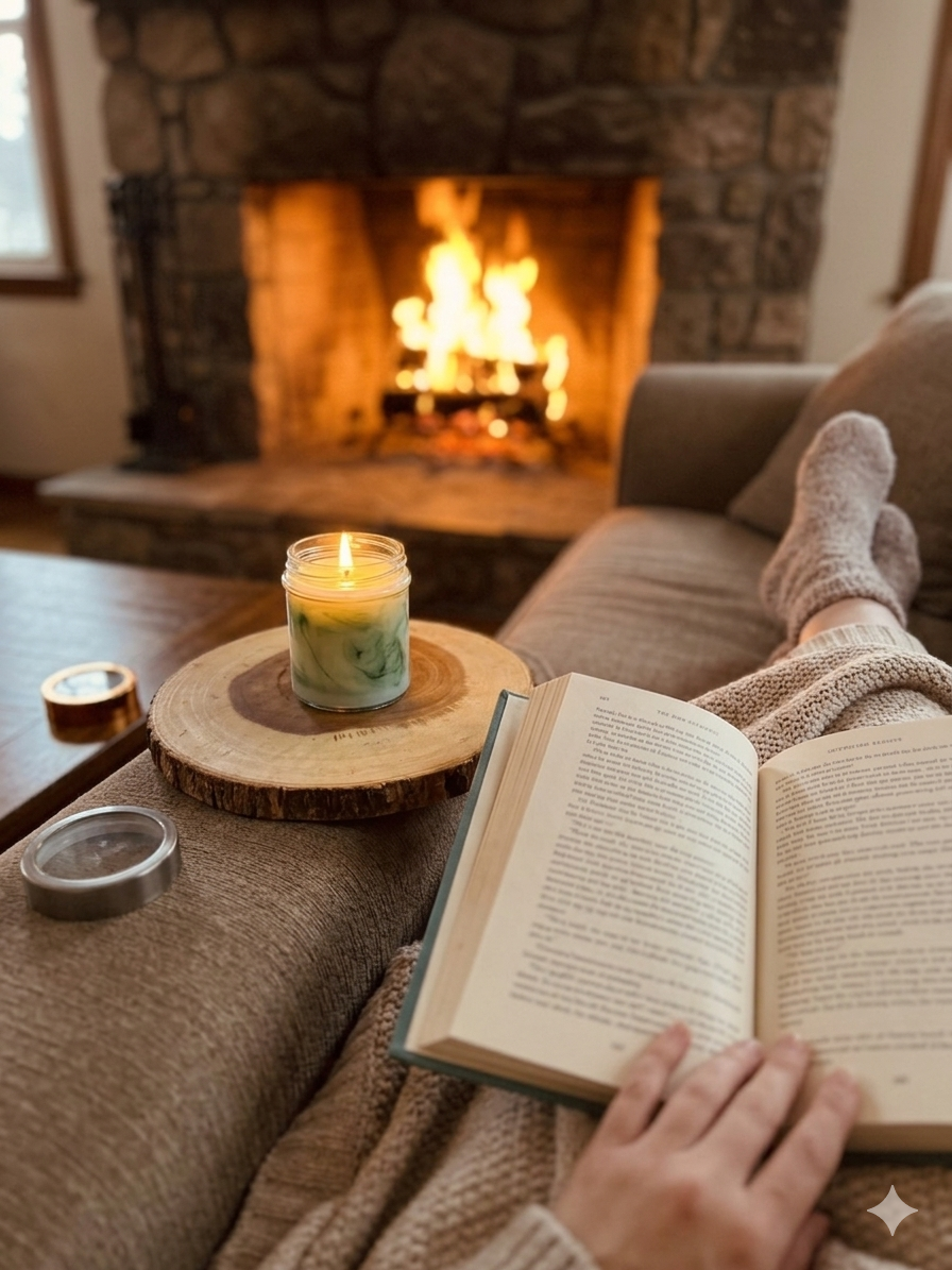 Imagine sinking into a plush armchair, a soft throw draped over your lap. The room is dimly lit, the main glow coming from a warm, crackling fireplace that casts gentle flickering shadows across the walls. Your favorite book rests in your hands, its pages slightly worn and inviting. Around you, your coconut wax candles burn softly, filling the air with subtle, comforting scents—maybe a hint of vanilla, rainwater, or blueberry cake—creating a cocoon of calm. The quiet hum of the fire, the gentle scent of the candles, and the slow turn of each page pull you deeper into a world of serenity, where time seems to pause and every breath feels soothing